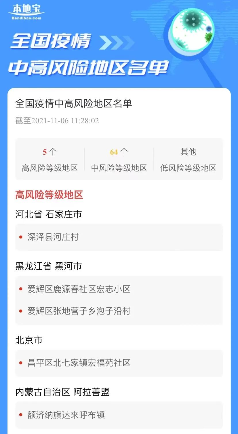 11月5日0—24时,31个省(自治区、直辖市)和新疆生产建设兵团报告新增本土确诊病例40例、本土无症状感染者14例。目前已有甘肃、内蒙古、陕西、青海、四川、湖北、湖南、贵州、黑龙江、江西、宁夏、河北、北京、云南、山东、辽宁、重庆、江苏、河南、浙江等多个省份报告阳性病例。截至11月6日11时,我国有5个高风险地区和64个中风险地区。