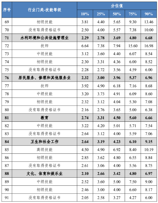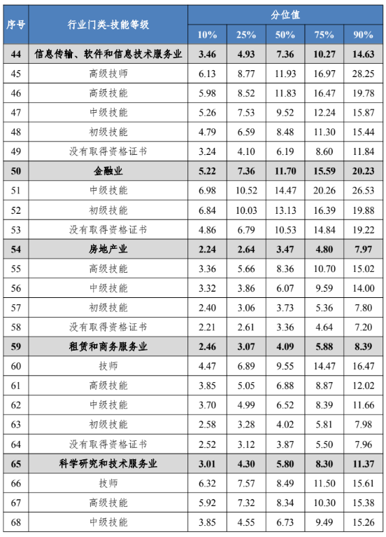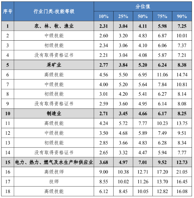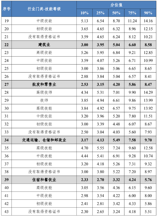 二、分行业门类不同技能等级的技能人才工资价位(单位:万元)