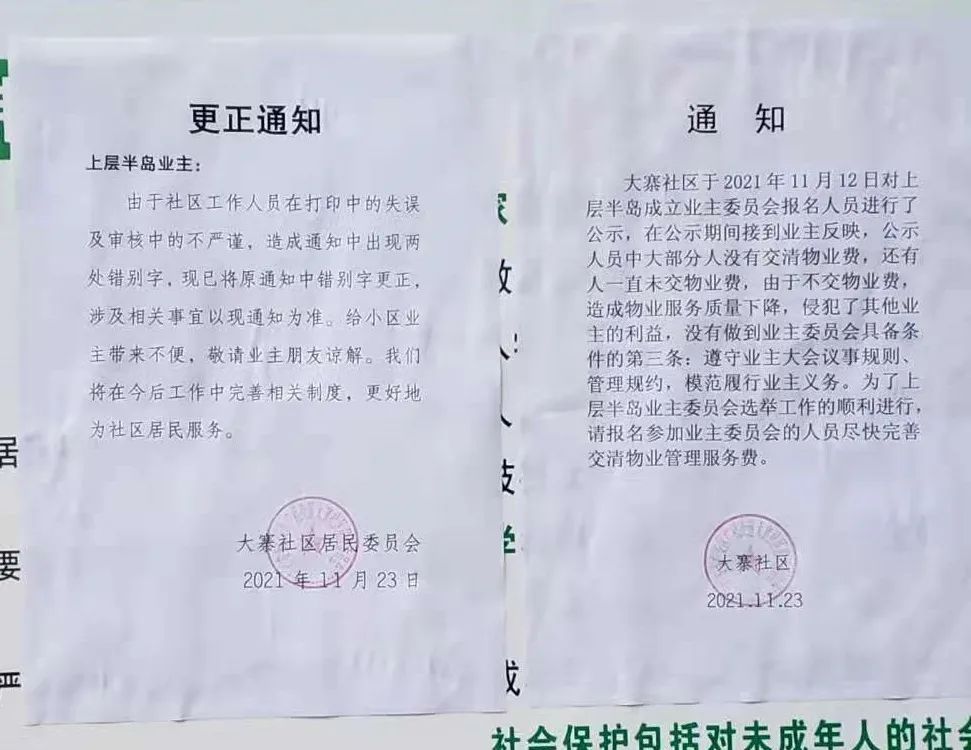随后,记者来到大寨社区党群服务活动中心了解情况。此时,大寨社区社区党委书记、居委会主任李云龙正拿着更正后的“通知”,准备前往上层半岛小区重新张贴。