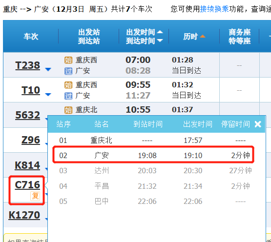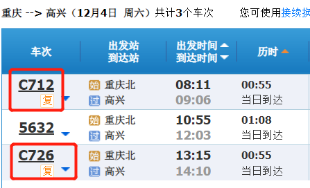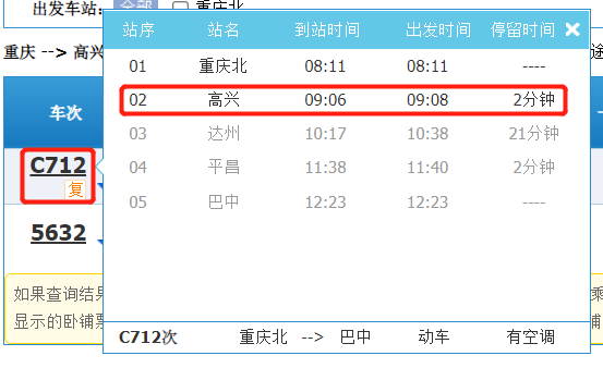 其中,12月3日起,重庆北至巴中方向开行C712次和C716次动车,C712次动车于重庆北08:11始发,沿途停靠高兴、达州、平昌站,12:23抵达巴中站,全程运行4小时12分钟;C716次动车于重庆北17:57始发,沿途停靠广安、达州、平昌站,22:06抵达巴中站,全程运行4小时9分钟。