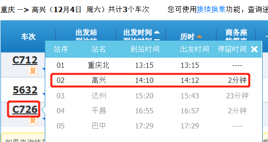 12月4日起,重庆北至巴中再增开C726次动车,重庆北13:15始发,沿途停靠高兴、达州、平昌站,17:29抵达巴中站,全程运行4小时14分钟。