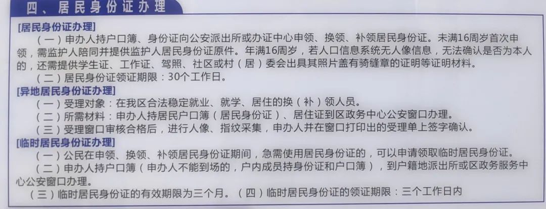 拍照、录入指纹、填写资料……近日,家住广安区的唐女士带着6岁女儿小卢来到广安区行政审批局户政大厅办理身份证。“我是昨天在区医保局了解到这个政策的,今天带着孩子过来,全程办理不超过半个小时。非常感谢这个政策,让我在广安当地就能够顺利办下来,不用带着孩子来回跑。” 据了解,唐女士一家长期工作和居住在广安区,但小卢的户口在贵州爷爷那边,平时办理医保有点麻烦。“为了方便给孩子办医保卡,特意前来咨询如何异地办理身份证事项。没想到,我们还是第一个在广安区办理居民身份证的贵州户籍呢!” 在广安区行政审批局户政大厅现场,小编了解到以前省外居民首次办理居民身份证,需回到户籍所在地的公安机关,很不方便。秉承“数据多跑腿,群众少跑路”的理念,广安区已启动首次申领居民身份证“川渝黔通办”业务,目前已办理完成27例(包含8月开通“省内通办”首次身份证申领)。 不明白怎么办理? 没关系! 小编准备了详细的办理攻略 (这么实用,还不赶紧收藏) ↓↓↓ 本人或者监护人代为申请 1.居民户口薄 2.合法稳定就业、就学、居住的其中一种证明材料 3.监护关系证明材料(未满16周岁的,与监护人不同户的提供) 申请受理 1.年满16周岁公民。本人提出申请+申领材料+签书面承诺书 2.未满16周岁公民。监护人陪同申请人+交验监护人具名户口簿、居民身份证(如未登记与申请人亲属关系则需提交申请人出生医学证明等其他证明监护关系材料)+申领材料+签书面承诺书 带上《居民身份证领取凭证》 本人领取、亲属代领、邮寄到家 拒绝领证“一波三折” 看完是不是一目了然呀 转发+收藏 让数据代替人工 “远隔千里”把事儿办完 “方便!”两个字我已经说累了