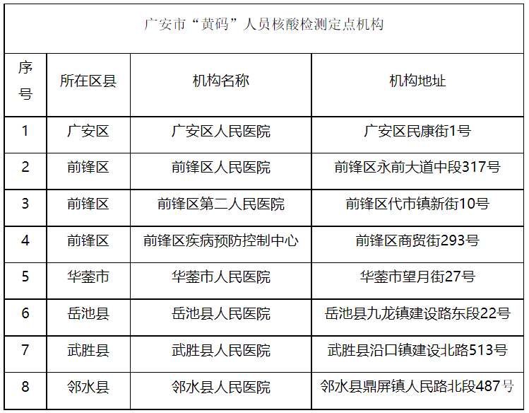 为切实做好疫情防控工作,方便“黄码”患者看病就医,确保群众及时就近进行核酸检测,现将全市核酸采样检测机构、“黄码”人员定点救治及核酸检测机构信息公示如下。