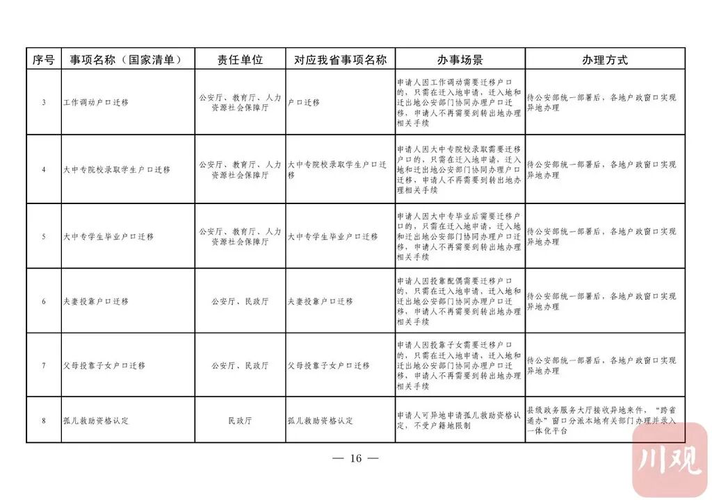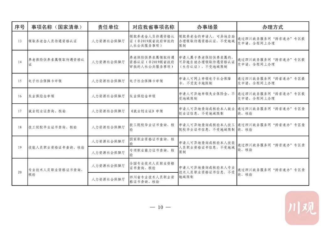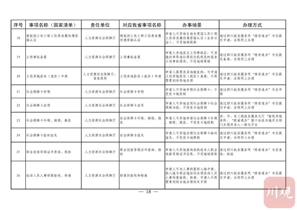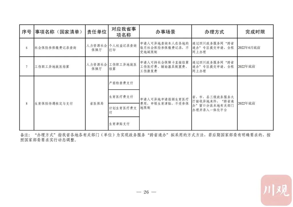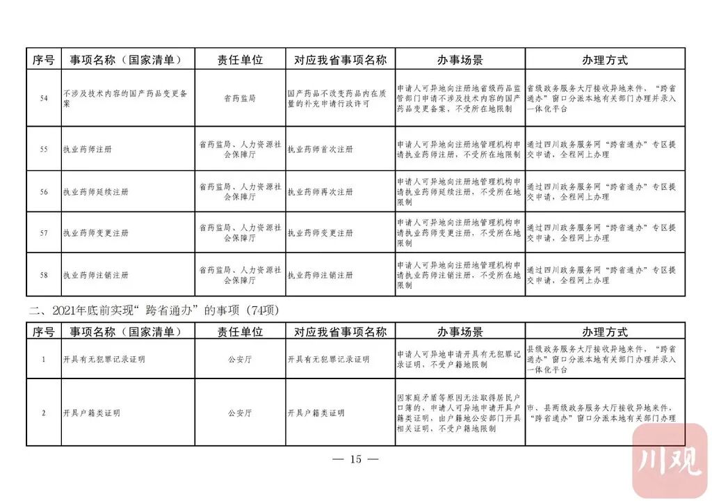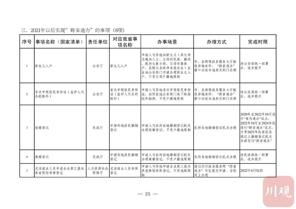 据悉,推动政务服务“跨省通办”旨在贯彻党中央国务院关于深化“放管服”改革优化营商环境决策部署,加快转变政府职能,提升政务服务能力。按照《四川省政务服务“跨省通办”任务清单》(以下简称《任务清单》),2020年底前,要实现第一批58项政务服务“跨省通办”,包括学历公证、失业登记、电子社会保障卡申领等政务服务。2021年底前基本实现74个高频政务服务事项“跨省通办”,并逐步纳入其他办事事项,有效满足各类市场主体和广大人民群众异地办事需求,为建设人民满意的服务型政府提供有力保障。2021年以后,新生儿入户、结婚登记等8项政务服务实现“跨省通办”。