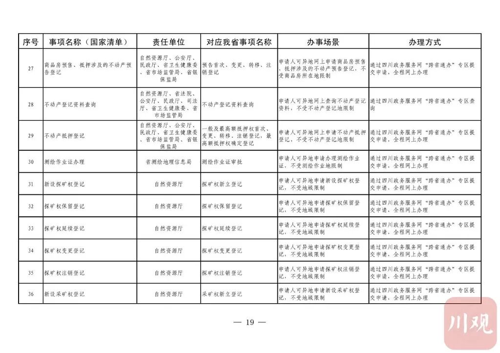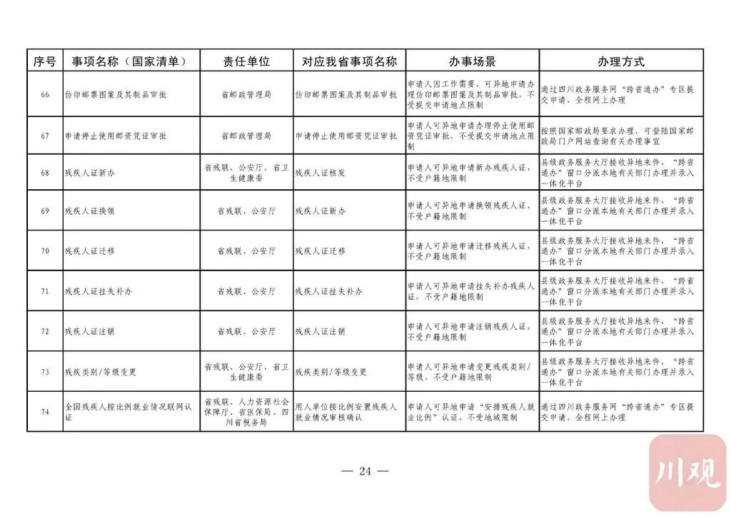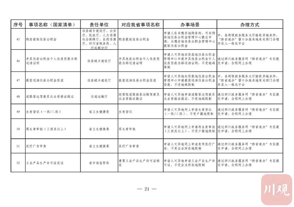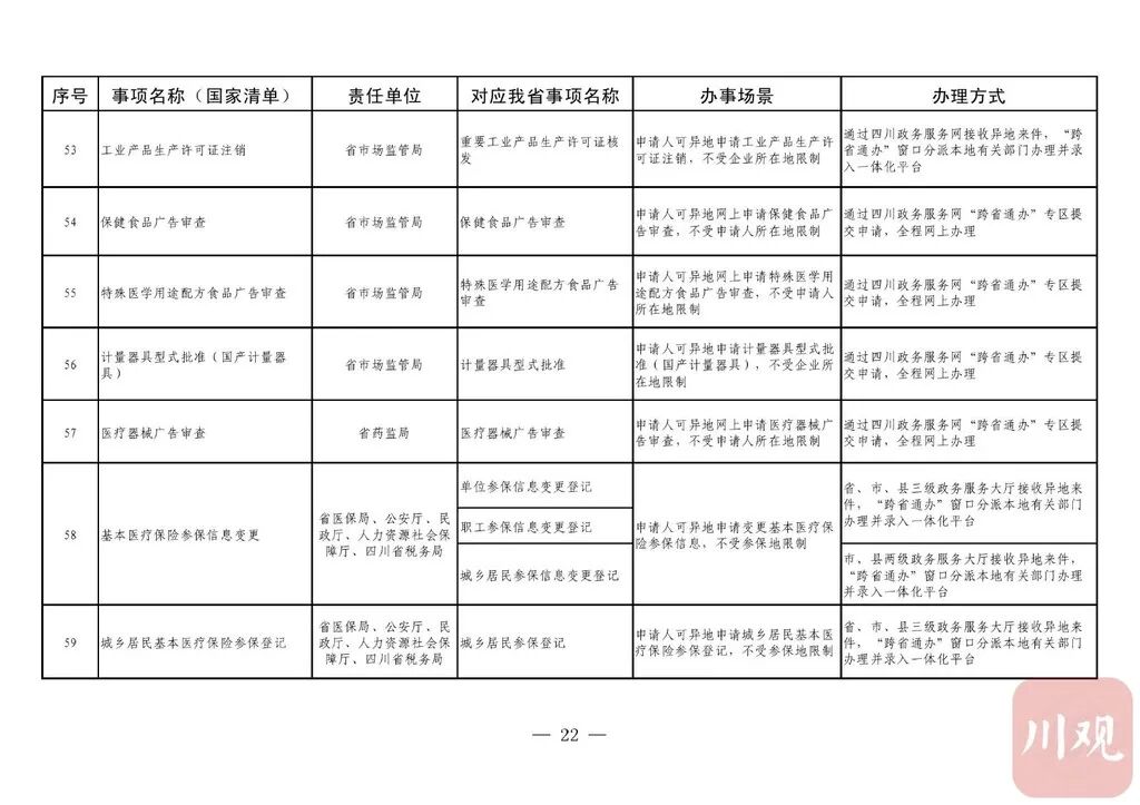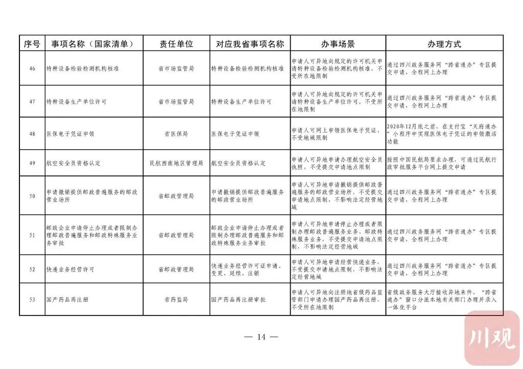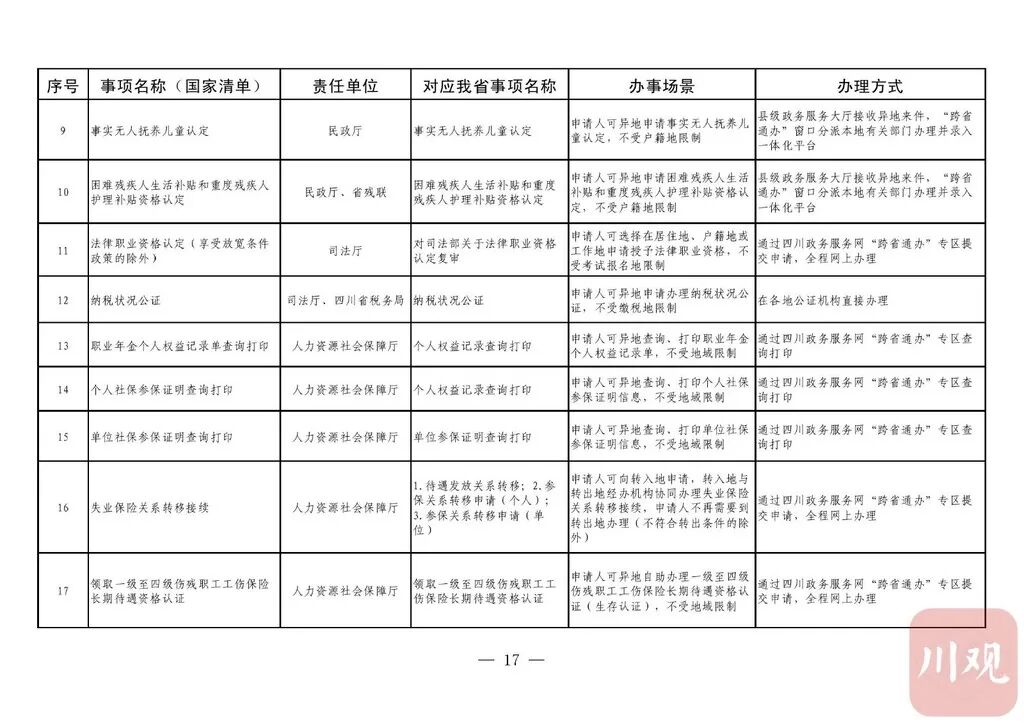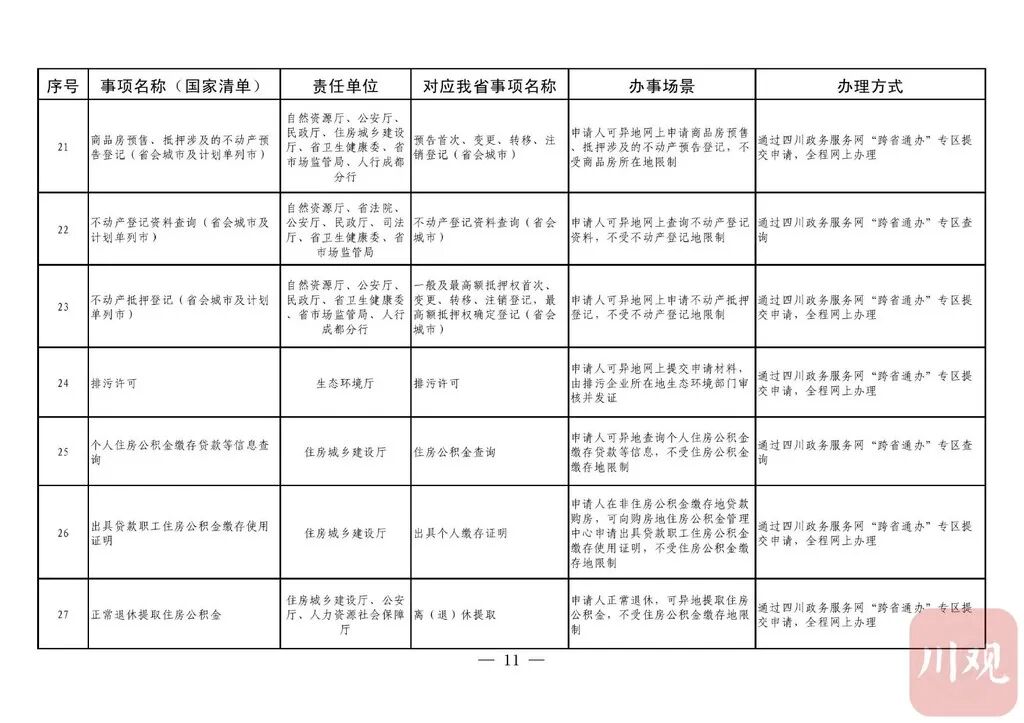《通知》要求,省直有关部门(单位)要积极对接国家部委,加强与其他省(自治区、直辖市)的沟通衔接,实现同一事项在不同地域无差别受理、同标准办理。“跨省通办”事项除法律法规有特殊规定必须到现场办理的以外,不得强制申请人到现场办理。省直有关部门(单位)按照“应上尽上”的原则,分批次将“跨省通办”事项纳入省一体化政务服务平台办理。对法律法规明确要求必须到现场办理的政务服务事项,在不改变其他省(自治区、直辖市)原有办理事权的基础上,各级政务服务机构要强化“一窗受理”,采用“收受分离”模式,做好代收事项申请材料的形式审查、身份核验,通过邮件寄递至业务属地部门(单位)完成办理。12月31日前,四川政务服务网、“天府通办”手机软件(APP)要开设政务服务“跨省通办”专区;省、市、县三级政务服务大厅要设置“跨省通办”窗口。