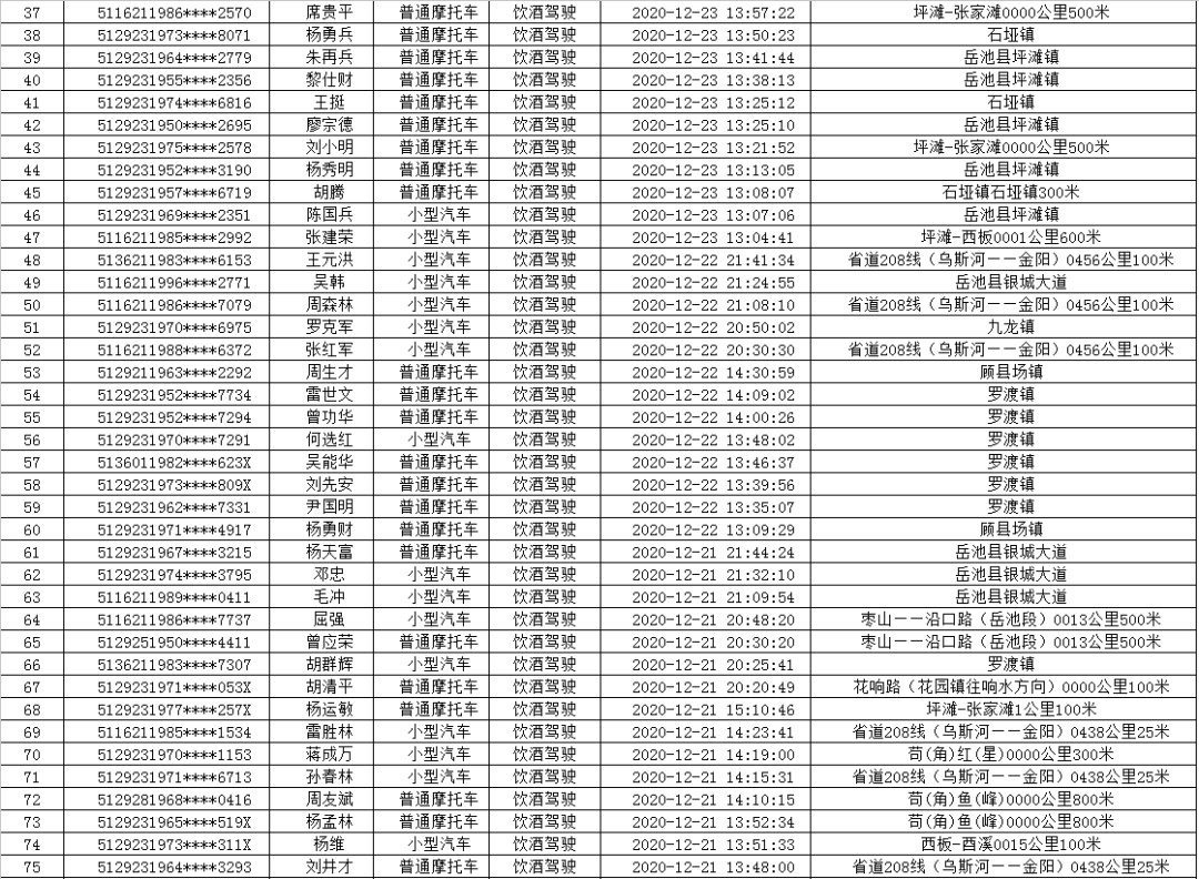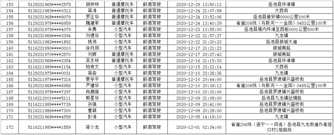 为切实做好道路交通安全管控工作,坚决预防重特大道路交通事故,岳池交警大队始终保持对酒驾、醉驾、再次饮酒驾驶等重点交通违法行为的高压严管态势,坚决消除驾驶人侥幸心理和交通安全隐患,力促广大交通参与者自觉养成“开车不喝酒,喝酒不开车”的良好习惯,切实营造安全、畅通、有序的道路交通环境。岳池交警大队集中曝光一批重点交通违法行为驾驶人名单(2020年12月1—31日),共计172起,其中饮酒驾驶150起、再次饮酒驾驶2起,醉酒驾驶20起。希望大家严格遵守道路交通安全法律法规,自觉做到安全驾驶,文明出行。