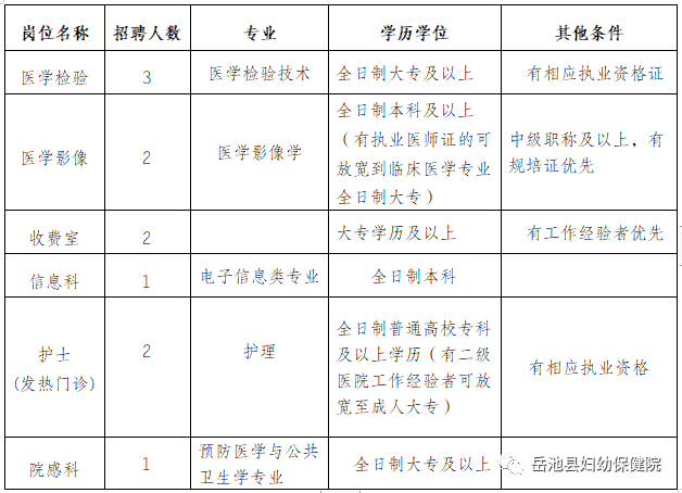 招 聘 公 告 因工作需要,我单位现面向社会公开招聘医务工作人员多名。现就招聘工作有关事项公告如下: 一、招聘对象与条件 (一) 岗位条件 (二)基本条件 1.拥护中国共产党,遵纪守法,品行端正; 2.身体健康,爱岗敬业; 3.沟通能力强,有团队合作精神; 4.年龄35周岁及以下。 二、报名事项 1.报名时间: 2021年1月8日至2021年1月11日。 2.报名地点:岳池县妇幼保健院工会办公室(7楼),岳池县成果街下段173号。 3.报名方式: 现场报名:限工作日上班时间。 网络报名:可将简历投至邮箱: 907791140@qq. com。 4.提交资料:报名时须如实填写《岳池县妇幼保健院应聘人员报名表》,并提交身份证、毕业证(学位证)等证书原件及复印件、教育部学历证书电子注册备案表打印件、本人近期一寸免冠彩照2张。 5.咨询电话: 0826-5242139,联系人:赵老师。 三、资格审查 报名人员填写的个人信息和提交的相关材料须真实、有效。如发现隐瞒真实情况或提供虚假资料的,一经查实,将取消聘用资格,并追究相应责任。 四、纪律与监督 招聘工作坚持“公开、平等、竞争、择优”原则,严肃招聘纪律,主动接受监督。 监督举报电话: 0826-5241602。 岳池县妇幼保健院 2021年1月8日 报名表下载链接(百度网盘):https://pan.baidu.com/s/1kQWfZMfsPylBjKbj4Mhqxg 提取码:24d2