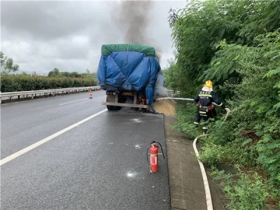 遂广高速岳池境内一运载稻谷的大型货车自燃
